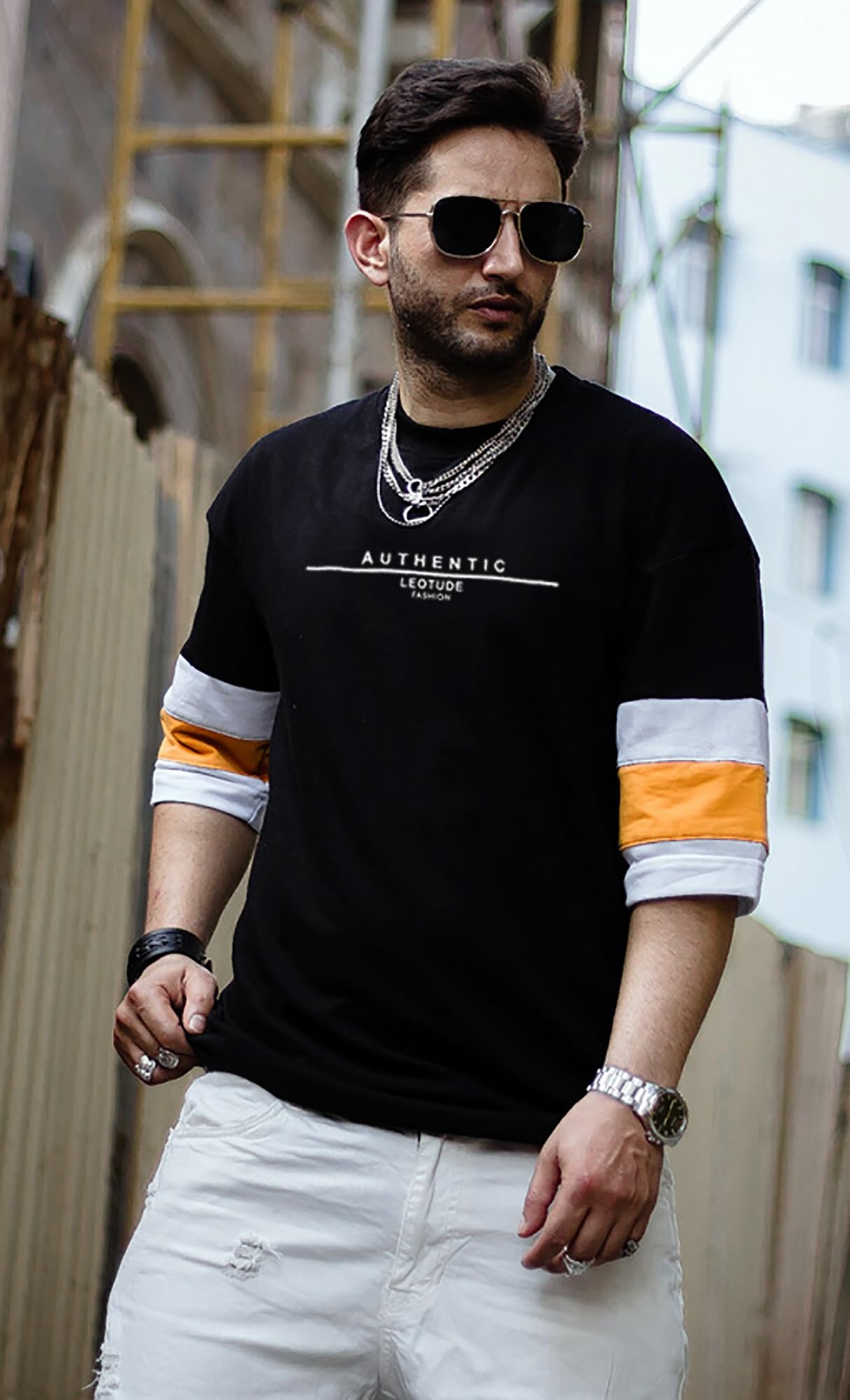 LEOTUDE Men's Cottoblend Half Sleeve Printed Oversized Drop Shoulder T-Shirt (Black Color)