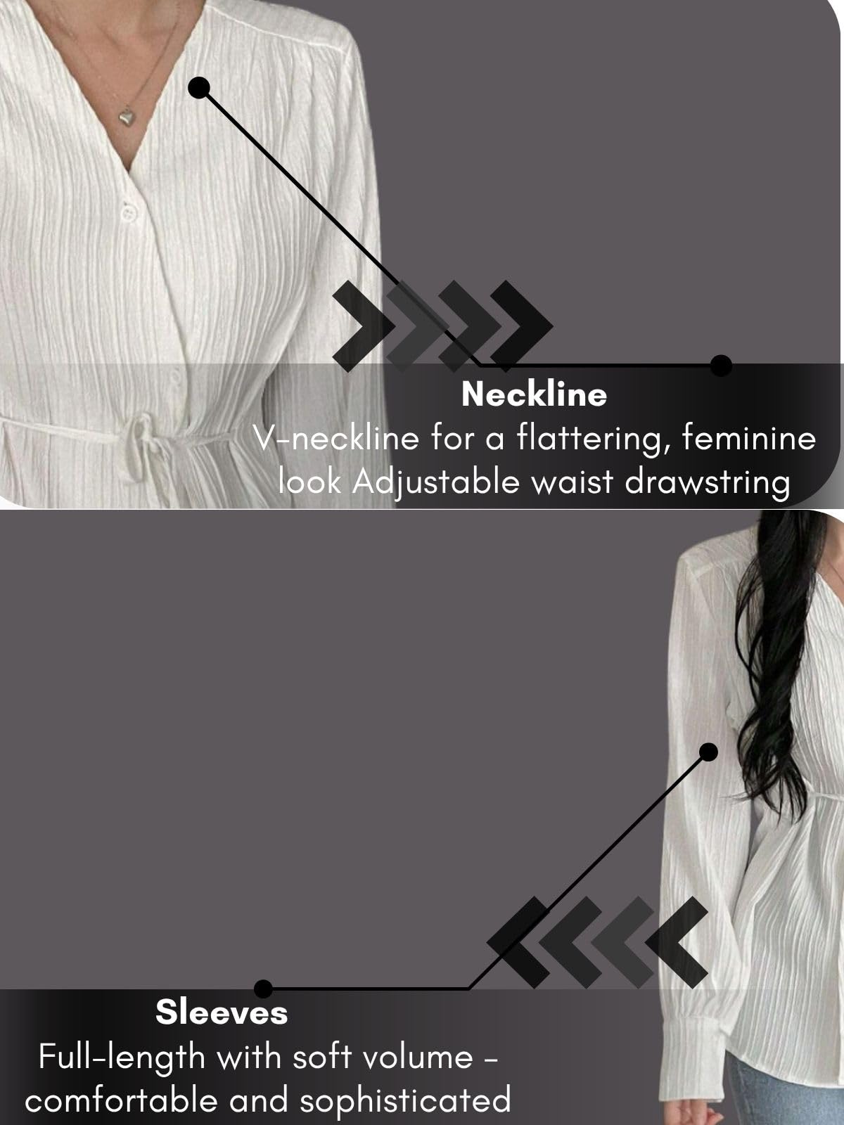 Designed with a flattering V-neck and pleated details, this blouse adds a touch of sophistication to any outfit.