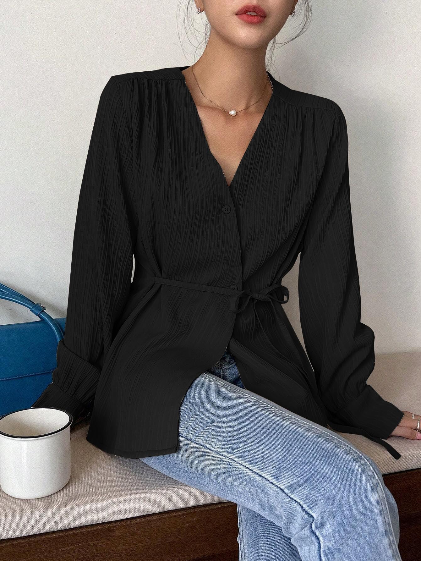 The adjustable belted waist enhances your silhouette, making this flowy blouse a chic addition to your wardrobe.